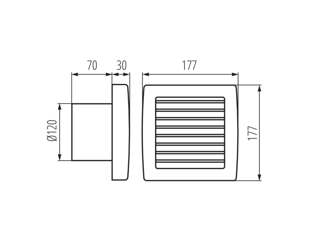Ventilátor s automatickou žaluzií - napájecí napětí: 230V, 50Hz - příkon motoru: 20W - objemový průtok vzdušiny: 100m3/hod při 7,5 Pa - krytí: IP X4 - třída izolace: II. - průměr výstupního hrdla: 120 mm - průměrná hladina akustického tlaku v jednom metru 38,5 dB - chvění: X/Y/Z = 3,94/1,71/2,37 mm/sDodatočné parametre