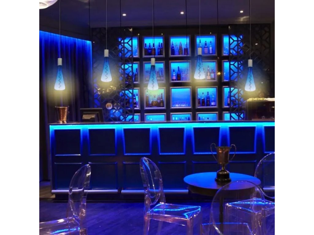 - použité LED sú filamenty so špeciálnym tvarom - Filament s jemne modrým sklom "BLUE", čo vytvára veľmi príjemný vizuálny efekt, vhodný na dotvorenie atmosféry v miestnosti