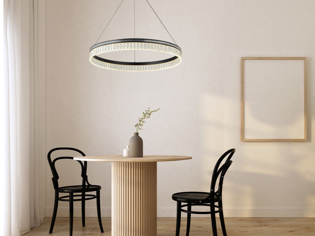 Dodajte svojmu interiéru štýl a eleganciu s dizajnovým závesným svietidlom THALIA N2102. Tento moderný luster s matnou čiernou povrchovou úpravou a dekoratívnymi krištáľovými prvkami sa stane centrálnym dizajnovým prvkom každej miestnosti – či už ide o obývačku, jedáleň alebo reprezentatívny priestor.
